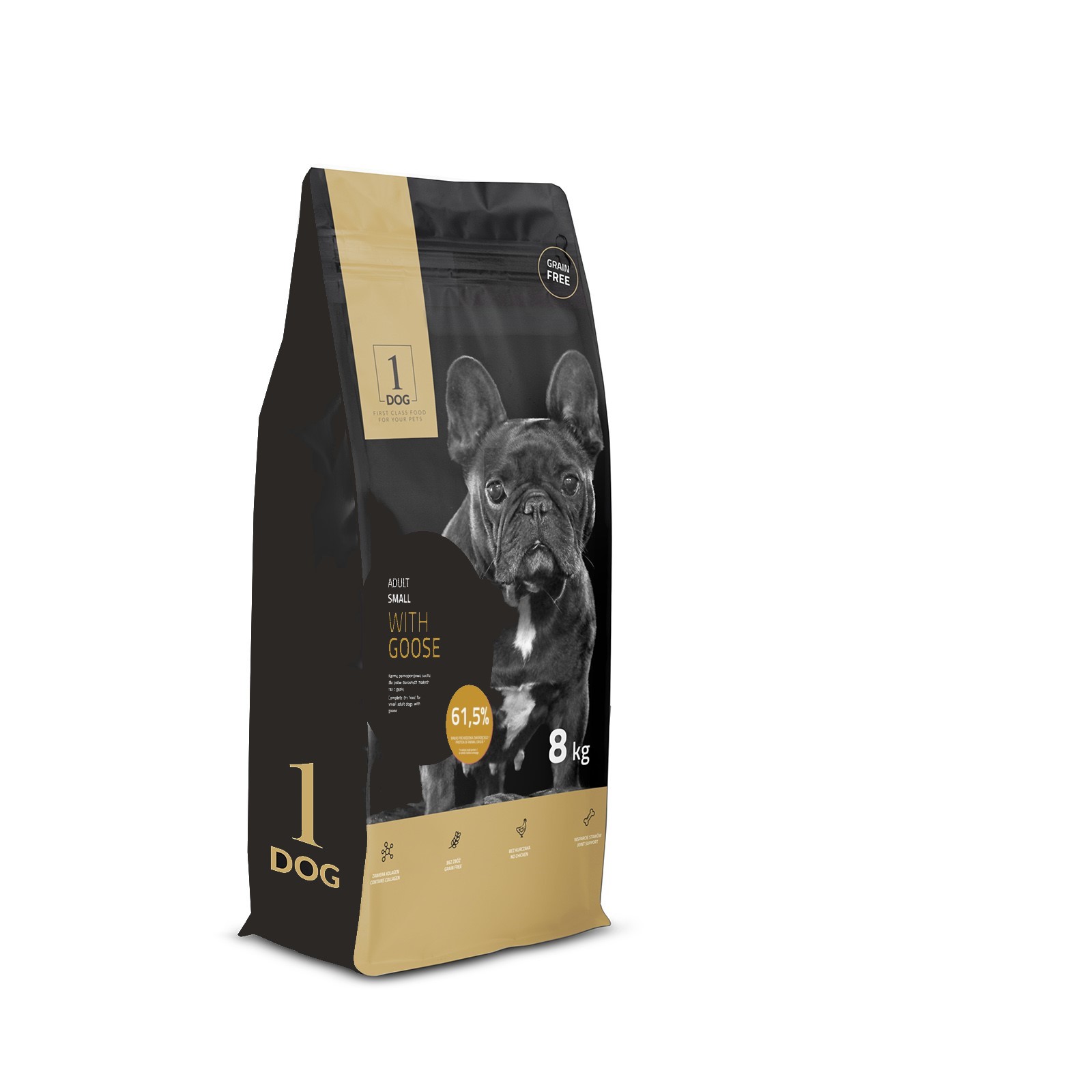 20% suszona gęś, ziemniaki, groch, groch obłuszczony, tłuszcz wieprzowy, wytłoki buraczane, jabłka suszoAne, hydrolizat wieprzowiny, drożdże piwowarskie, minerały, MOS, MSM, hydrolizowany kolagen, siarczan glukozaminy, siarczan chndroityny
