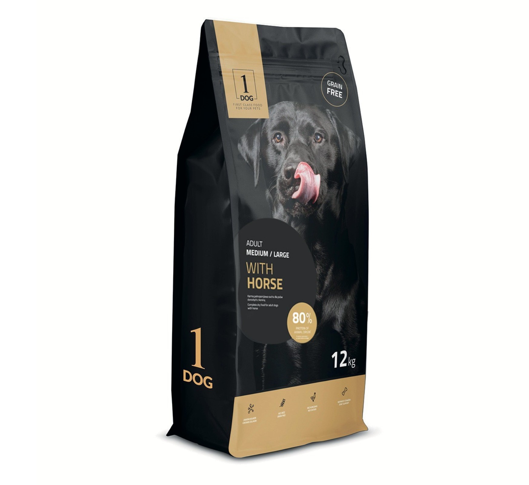 Konina 42% (suszona konina 30%, świeża konina 12 %), płatki ziemniaczane, tłuszcz wieprzowy, groch, groch obłuszczony, suszone jabłko, wytłoki buraczane, hydrolizat wieprzowiny, drożdże piwowarskie, minerały, mannooligosacharydy, fruktooligosacharydy, MSM, hydrolizowany kolagen, siarczan glukoza miny, siarczan chondroityny