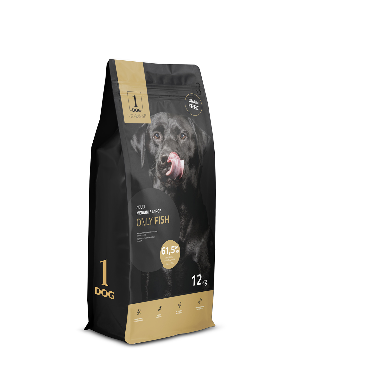 20% suszona ryba, ziemniaki, groch, groch obłuszczony, olej z łososia, wytłoki buraczane, jabłka suszone, hydrolizat łososia, drożdże piwowarskie, minerały, MOS, MSM, hydrolizowany kolagen, siarczan glukozaminy, siarczan chndroityny